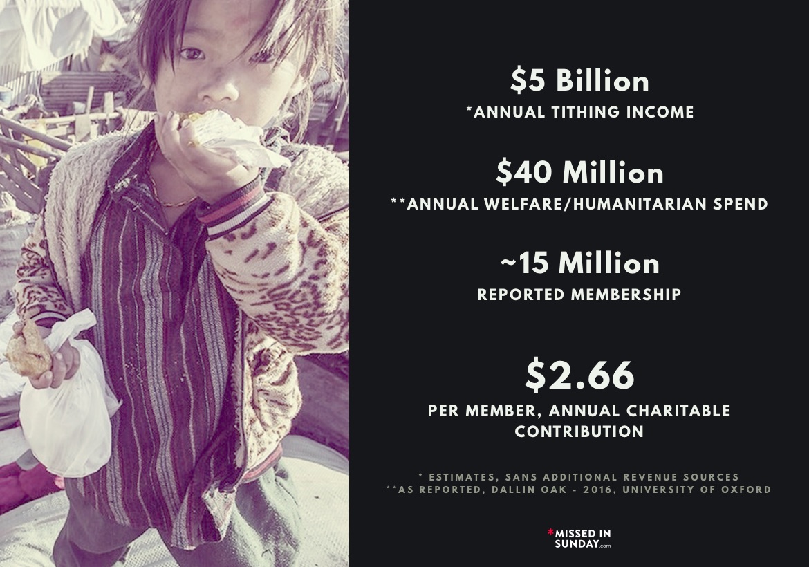 Though the LDS church has a robust welfare program, funded through fast offerings, the percentage of tithing funds that go towards external humanitarian causes is fairly low considerings it substantial resources. Even adjusting the estimated numbers to lean more conservative, the per-member donation would still fall under $10 annually.