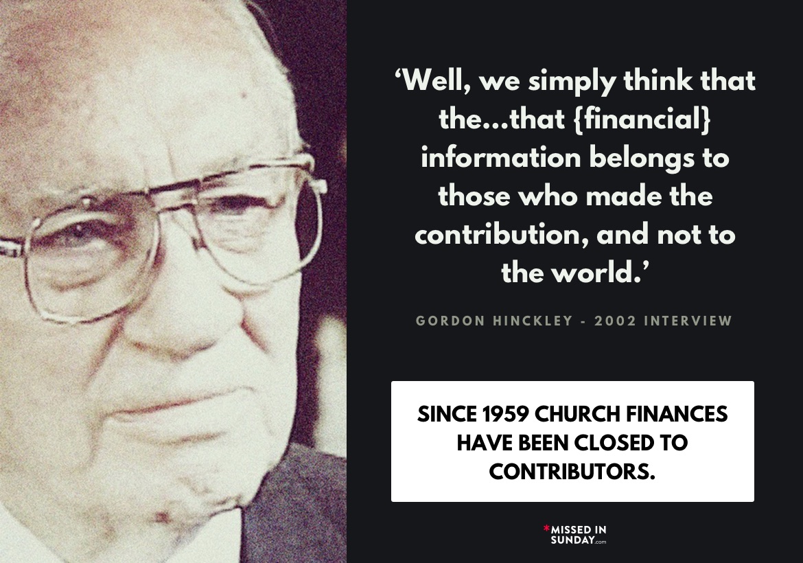 When asked about the Church’s lack of financial reporting by a reporter in 2002, then LDS Prophet, Gordon Hinkley responded as follows: