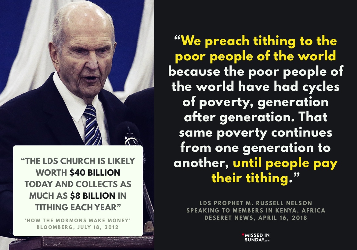 “According to U.S. law, religions have no obligation to open their books to the public, and the LDS Church officially stopped reporting any finances in the early 1960s. In 1997 an investigation by Time used cross-religious comparisons and internal information to estimate the church’s total value at $30 billion. The magazine also produced an estimate that $5 billion worth of tithing flows into the church annually, and that it owned at least $6 billion in stocks and bonds. The Mormon Church at the time said the estimates were grossly exaggerated, but a recent investigation by Reuters in collaboration with sociology professor Cragun estimates that the LDS Church is likely worth $40 billion today and collects up to $8 billion in tithing each year.”