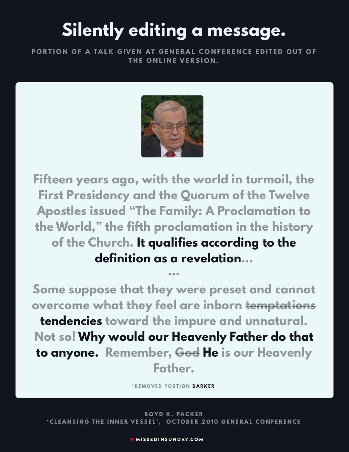 Note: Bolded are the parts of the talk given in the original address, not appearing in written format on the official LDS church website.