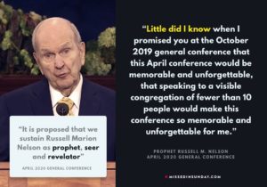 Excerpt from an April 2020 General Conference address by Russell M. Nelson: 1 Little did I know when I promised you at the October 2019 General Conference that this April conference would be memorable and unforgettable—that speaking to a visible congregation of fewer than 10 people would make this conference so memorable and unforgettable for … Continue reading Little did I know