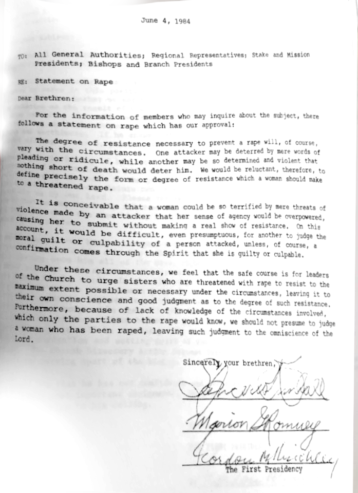 Statement from the First Presidency of the LDS Church regarding rape, June 4, 1984: