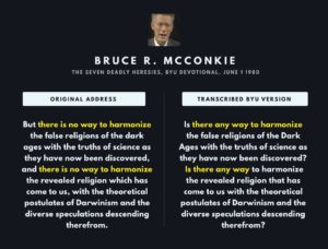 Excerpt from a June 1, 1980 BYU devotional by Apostle Bruce R. McKonkie (original address): 1 Heresy two concerns itself with the relationship between organic evolution and revealed religion and asks the question whether they can be harmonized. There are those who believe that the theory of organic evolution runs counter to the plain and … Continue reading Seven Deadly Heresies