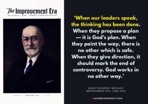 Excerpt from a Improvement Era, June 1945, Ward Teachers’ Message: 1 “When our leaders speak, the thinking has been done. When they propose a plan — it is God’s plan. When they point the way, there is no other which is safe. When they give direction, it should mark the end of controversy. God works … Continue reading The Thinking is Done
