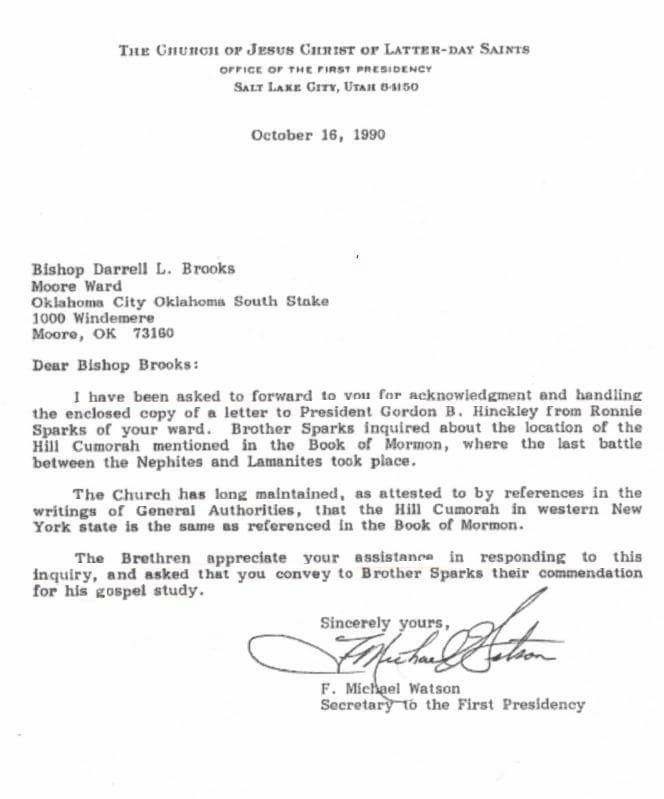 From an October 16, 1990 letter from the secretary of the First Presidency addressing a question from a Brother Sparks about the location of the Hill Cumorah referenced in the Book of Mormon:[footnote]First Presidency Letter on Location of Hill Cumorah – Joseph Smith Foundation[/footnote]